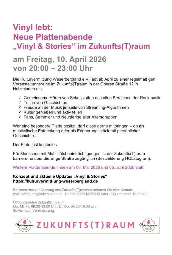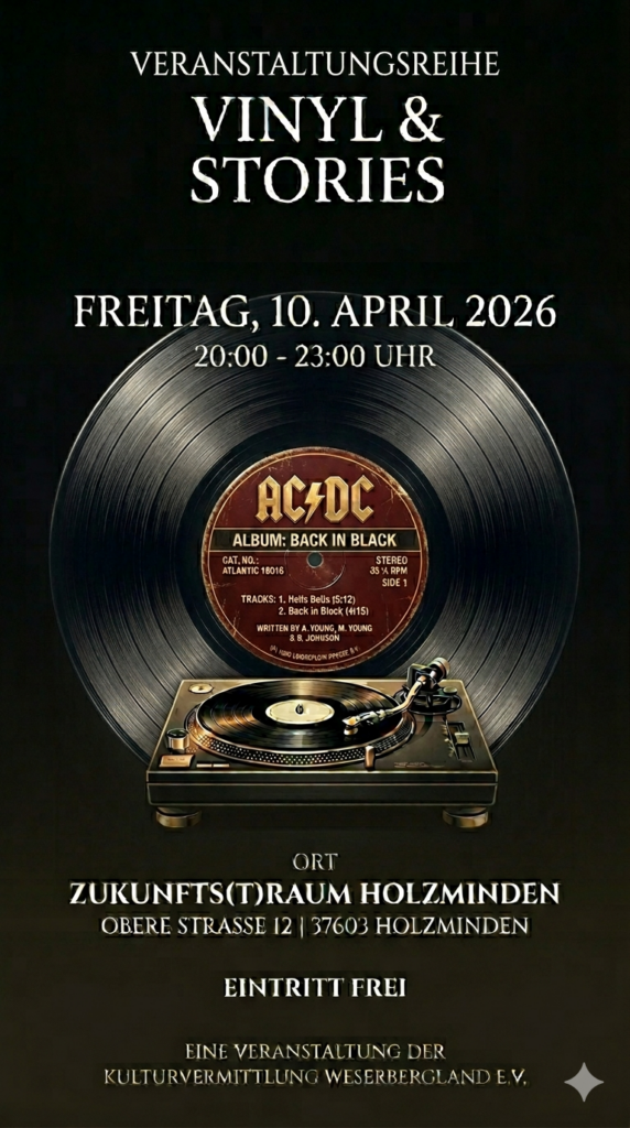 Für unsere Veranstaltungsreihe „Vinyl & Stories“ haben wir erstmalig einen regelmäßigen Ort für unsere Plattenabende gefunden. Der Zukunfts(T)raum Holzminden ermöglicht uns erstmal 3 Termine: 10.04.26, 08.05.26, 05.06.26 – Weitere Termine werden noch geplant. Wir halten Euch auf dem Laufenden!