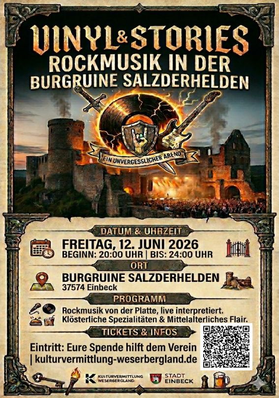 Am Freitagabend, den 12. Juni 2026, laden wir zur nächsten Runde unserer Veranstaltungsreihe „Vinyl & Stories“ ein – und zwar im Gewölbekeller der historischen Burgruine in Salzderhelden. Im jahrhundertealten Ambiente der Heldenburg entfaltet Rockmusik vom Plattenteller eine ganz besondere, authentische Wirkung.