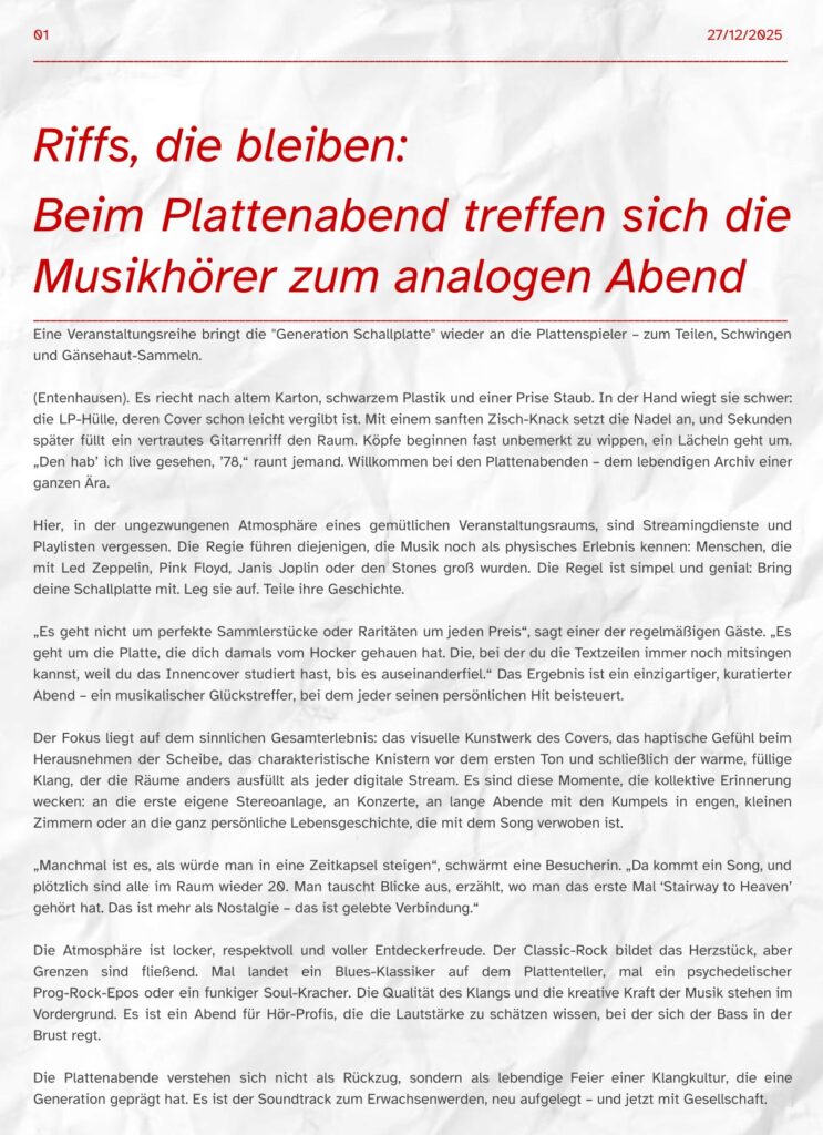 Das Plattencover sieht verlockend aus. Du schnappst es Dir und nimmst die Platte mit sicherem Handgriff aus der Hülle, um sie auf den Plattenspieler zu legen. Du lässt die Nadel auf die Platte absinken, hörst das leichte Knacksen der Einlaufrille und spürst schon, das sich da etwas Genussvolles anbahnt! Jetzt aber schnell in Deinen Lieblingssessel, zurücklehnen und in Ruhe dem Klang der Platte zuhören! Genuss kann so einfach sein!